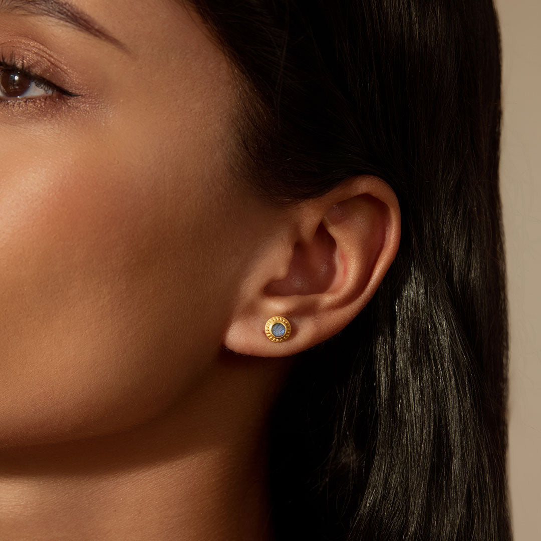 In this quiet moment, find the divine voice within you; listen to the truth it whispers. Round labradorite, stone of intuition, is surrounded by delicate beads of 18kt gold plate for everyday stud earrings to wear alone or as part of your personalized ear stack.